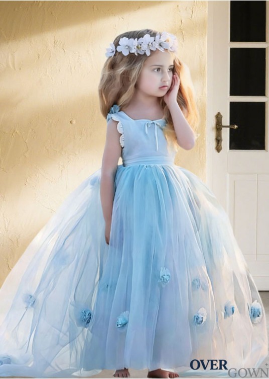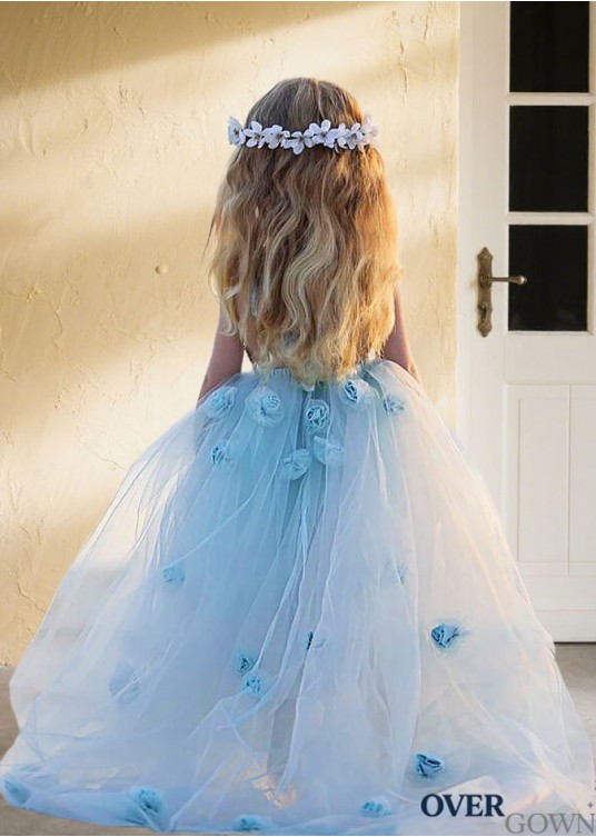 Bateau Neck Flower Girl Ball Gown - Hand-Made Flower Tulle Dress Floor Length