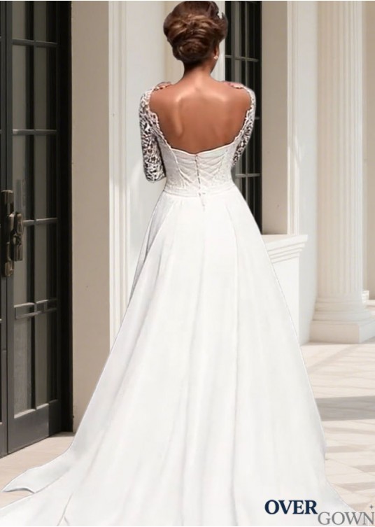 Bateau Neck Chapel Train Wedding Gown in Lace & Chiffon
