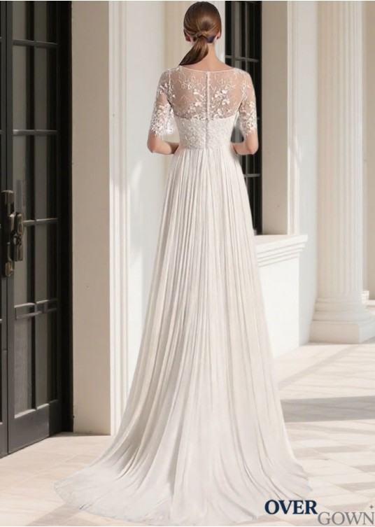 Raised Waist Full Length Bateau Neck Lace Tulle A-Line Bridal Gown - Half Illusion Sleeve Beach Wedding