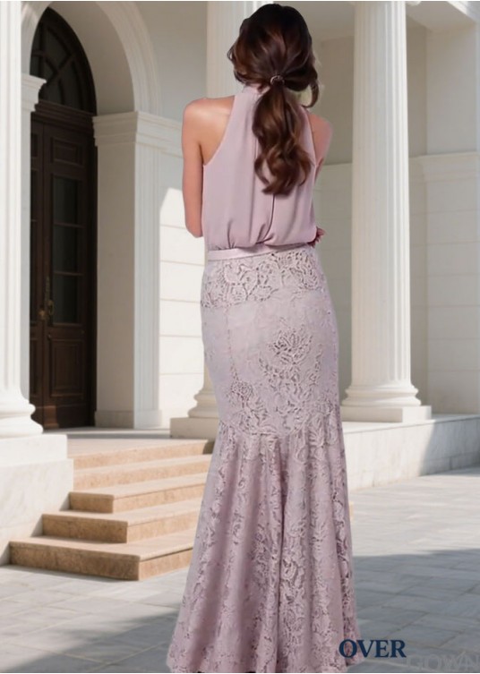 High Collar Chiffon & Lace Bridesmaid Dress – Full Length Sheath Gown