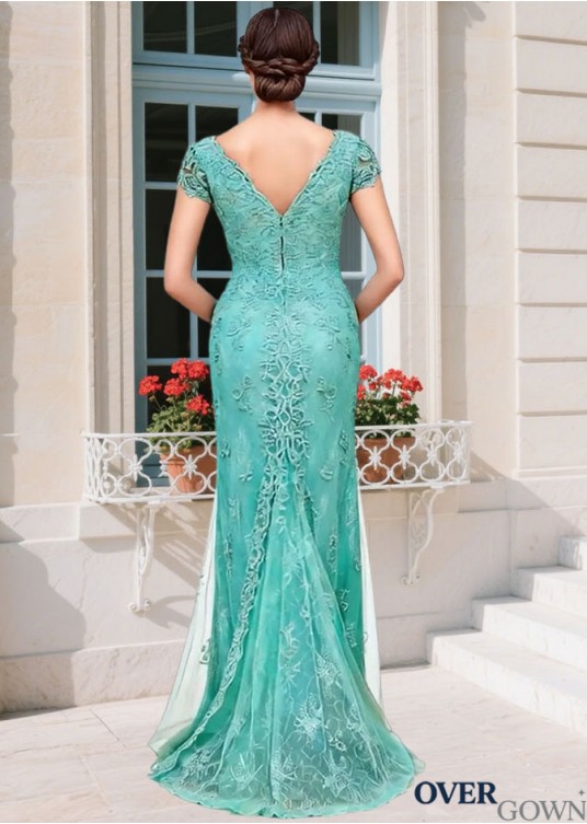 Sheath Column V-Neck Cap Sleeve Tulle Lace MOB Dress Full Length