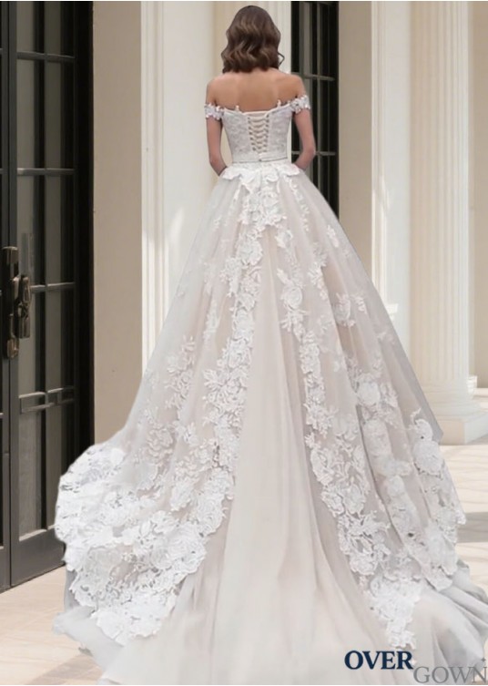Off The Shoulder Tulle Wedding Dress with Short Sleeves and Monarch Train – Elegant A-Line Bridal Gown