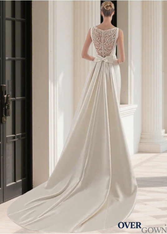 Elegant Satin Bateau Neck Sleeveless Sheath Wedding Dress with Chapel Train