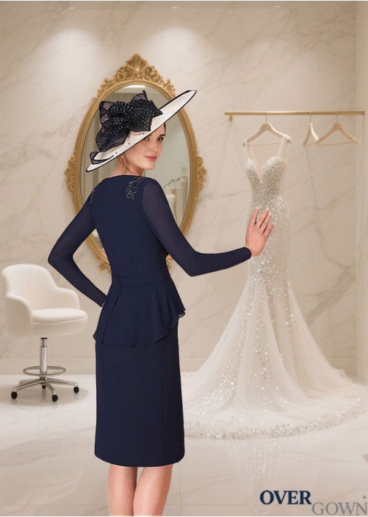 Elegant navy chiffon sheath dress featuring a flattering V-neck and long sleeves. The knee-length cut and sleek silhouette create a sophisticated, formal look—perfect for weddings, evening events, or professional occasions. Lightweight chiffon fabric ensures comfort and grace in every movement.