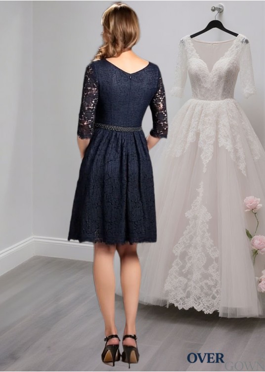 Elegant Knee-Length Lace V-Neck Mother of the Bride Dress with Illusion Sleeves