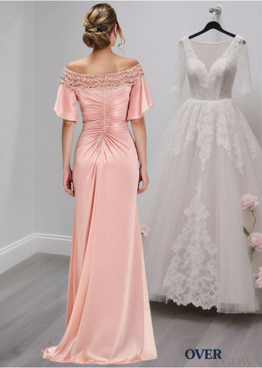 Pink Off-the-Shoulder Mother of the Bride Dress with Lace and Short Sleeves