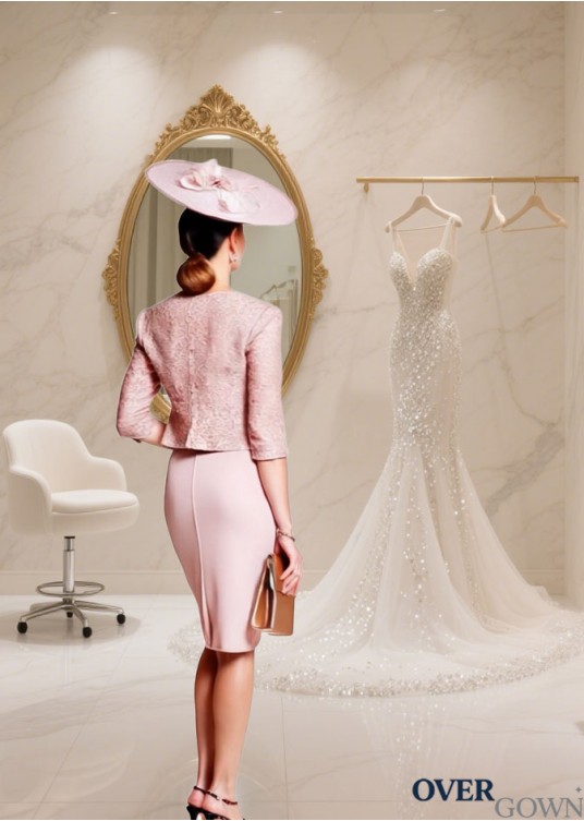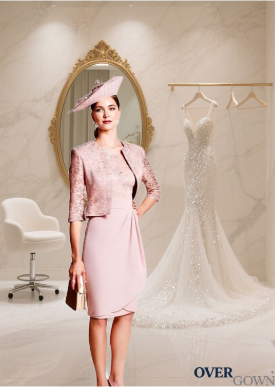 This elegant pink two-piece mother dress features a soft lace and chiffon design with a flattering sheath silhouette. The scoop neckline and coordinating jacket offer a polished look, perfect for weddings, parties, or evening events.
