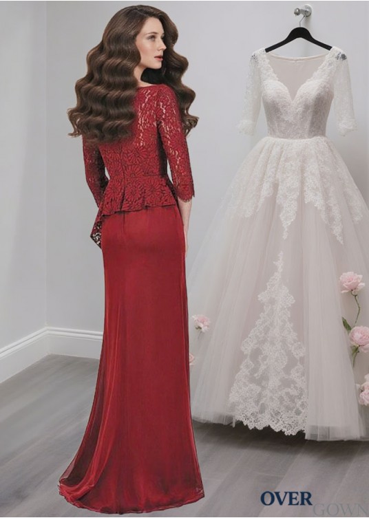 Lace & Chiffon Mother of the Bride Dress – Full Length Sheath Gown with 3/4 Sleeves