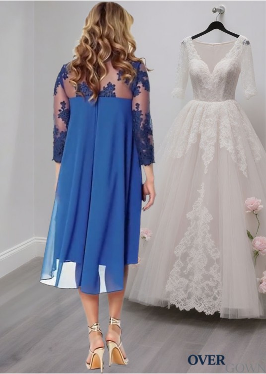 Blue Jewel Neck Tea-Length Mother of the Bride Dress With Long Sleeves