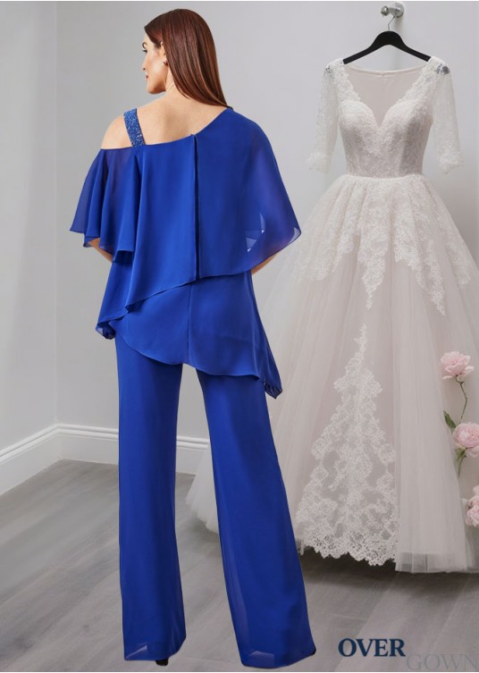 Royal Blue Chiffon Asymmetrical Neck Mother of the Bride and Groom Pantsuit