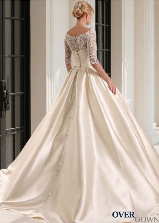 Elegant Bateau Neck Lace Satin Wedding Gown Sweep Train