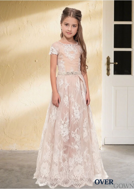 Floor-Length Lace Flower Girl Dress with Satin A-Line