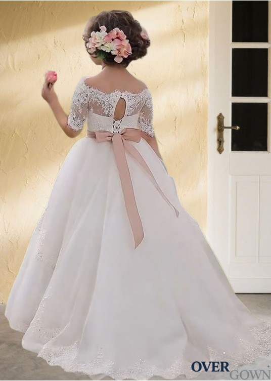 Floor-Length Short Sleeve Off-Shoulder Tulle Flower Girl Dress