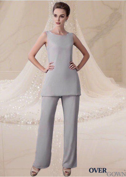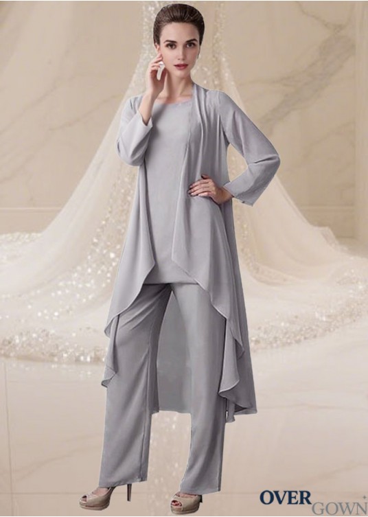 Elegant Gray Three-Piece Chiffon Mother of the Bride Pantsuit – Full Length with Jacket