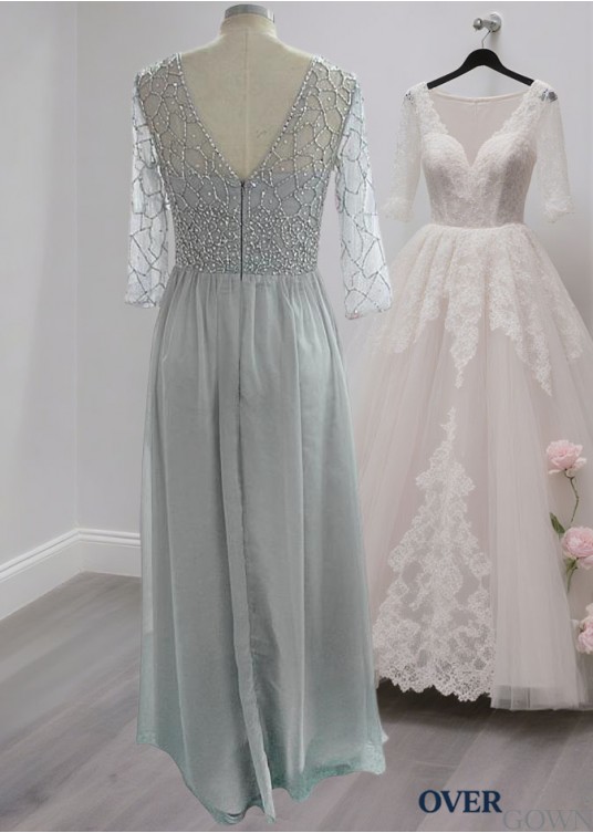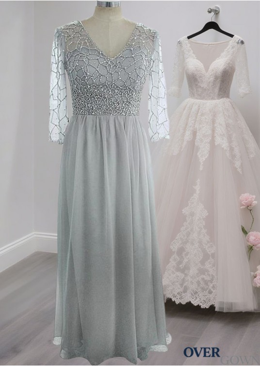 Gray V-Neck Mother of the Bride Dress – A Line Gown in Tulle and Sleeves