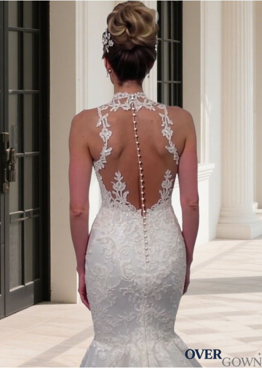 High Neck Lace Tulle Mermaid Beach Wedding Dress Sleeveless Floor Length