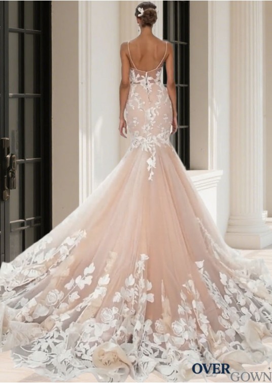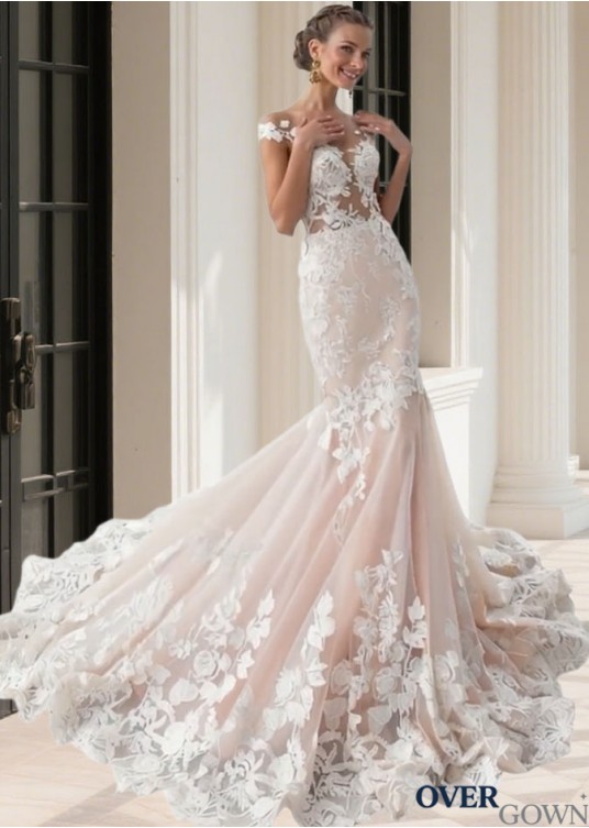 Jewel Neck Tulle Mermaid Wedding Dress with Chapel Train Elegant Bridal Gown