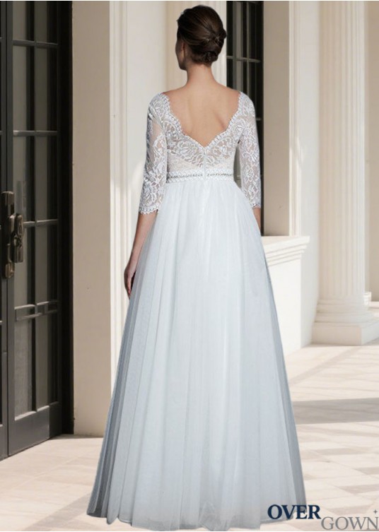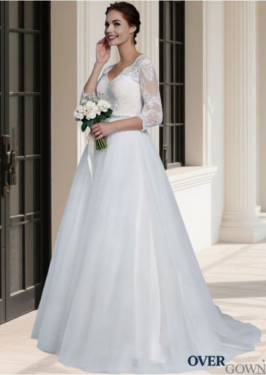 3/4 Sleeve Lace Embellished Princess Bridal Gown Tulle