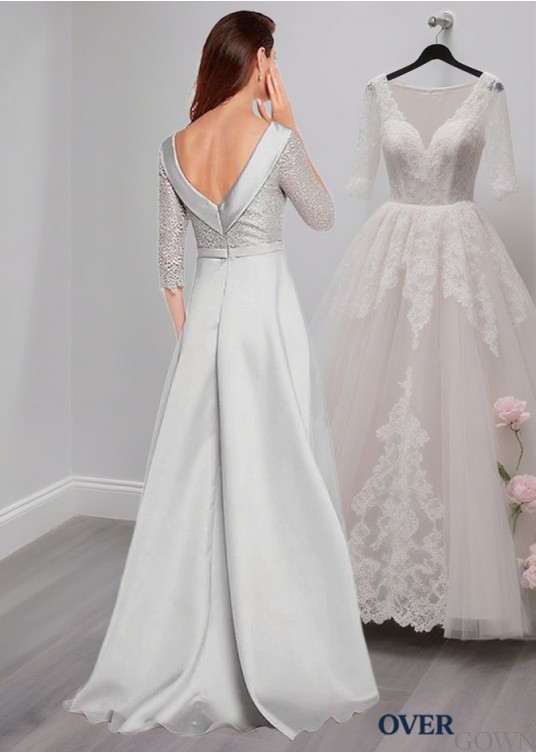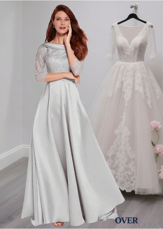 Lace Satin A-Line Mother of the Bride Dress with Bateau Neckline and Illusion Sleeves