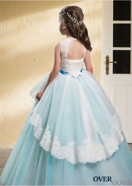 Jewel Neck Long Tulle Flower Girl Dress Satin Ribbon Belt