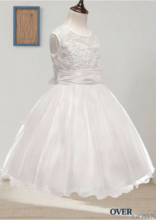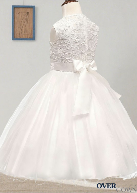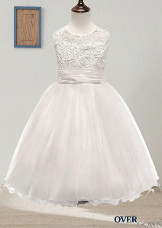 Long White A-Line Flower Girl Dress Lace & Tulle