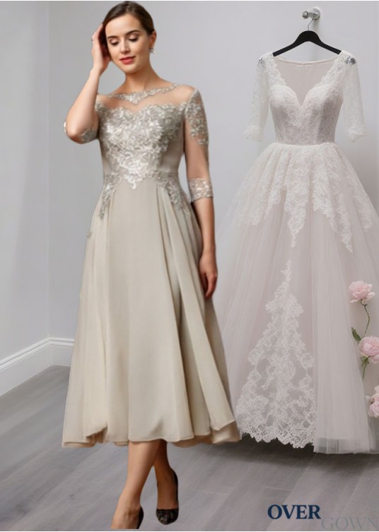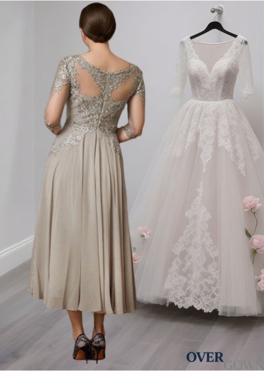 Tea-Length Lace Mother of the Bride Dress with 3/4 Sleeves