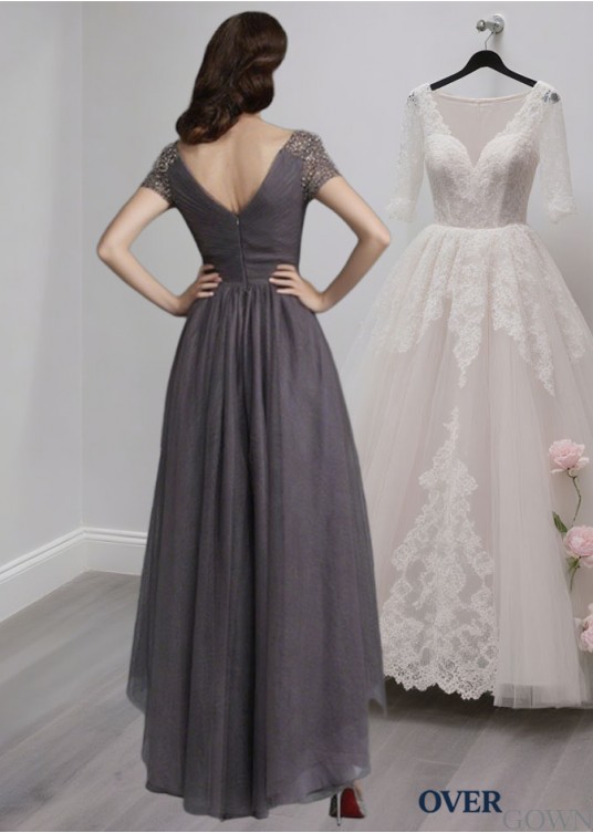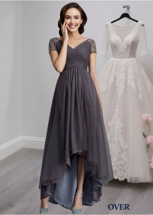 Elegant V-Neck Tulle A-Line Mother of the Bride Dress with Asymmetrical Hem