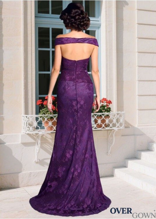 Off-Shoulder Sleeveless Lace Sheath Mother Dress with Train
