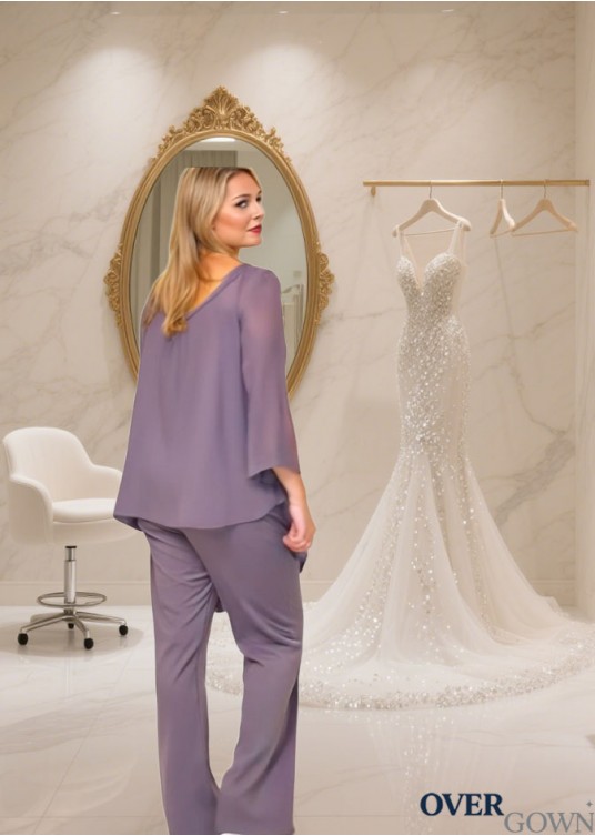 This elegant mother of the bride pantsuit features a soft chiffon fabric with a flattering scoop neckline and comfortable elastic waist. The long sleeves add modesty and grace, making it ideal for weddings, formal events, and special occasions.
