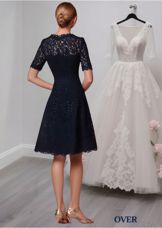Lace Prom Evening Party Dress with Short Sleeves and Jewel Neckline