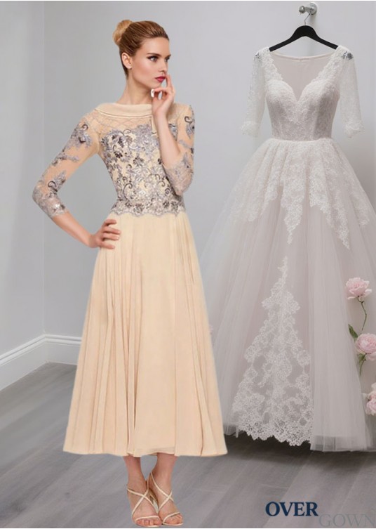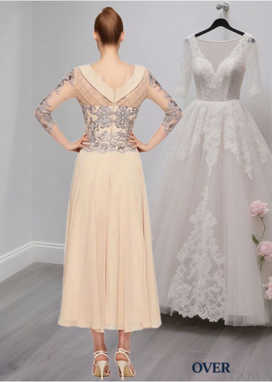 Chiffon Tea-Length Mother of the Bride Dress with Lace and 3/4 Sleeves