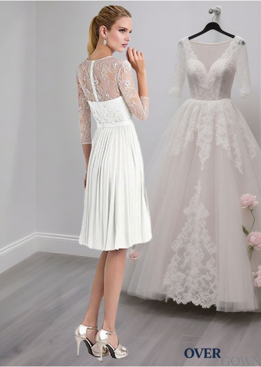 White Lace Chiffon Knee-Length A-Line Formal Dresses with 3/4 Sleeves