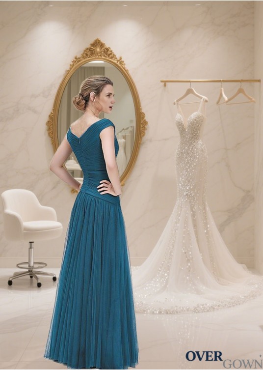 Blue V-Neck A-Line Full-Length Mother of the Bride Dress with Cap Sleeves