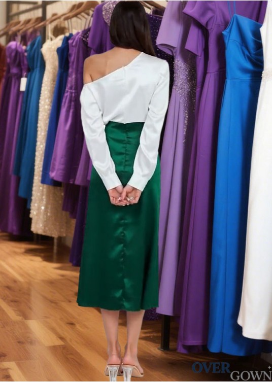 One Shoulder Satin A-Line Prom Dress with Long Sleeve and Front Slit