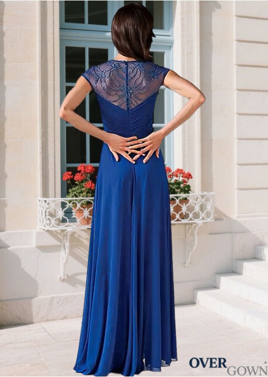 Queen Anne Neckline Cap Sleeve Blue Chiffon A-line Full Mother Dress