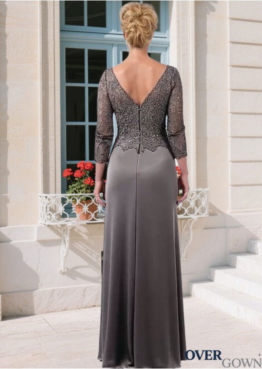 Elegant Satin Chiffon & Lace Mother of the Bride Dress – Bateau Neck A-Line Gown with Illusion Sleeves, Full Length
