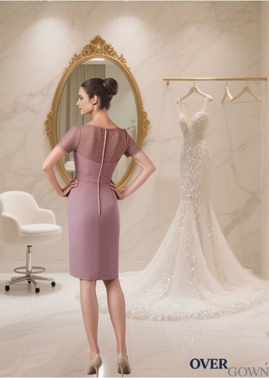 Knee-Length Satin Mother of the Bride Dress with Jewel Neckline and Illusion Sleeves