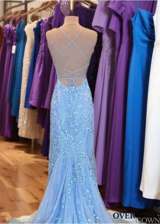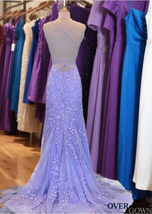 Crystal Embellished Lace Mermaid Prom Dress with Scoop Neck and Sweep Train