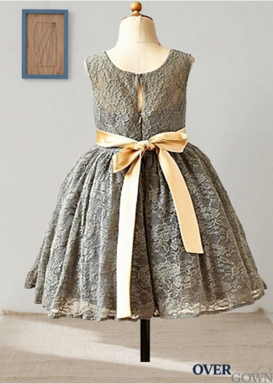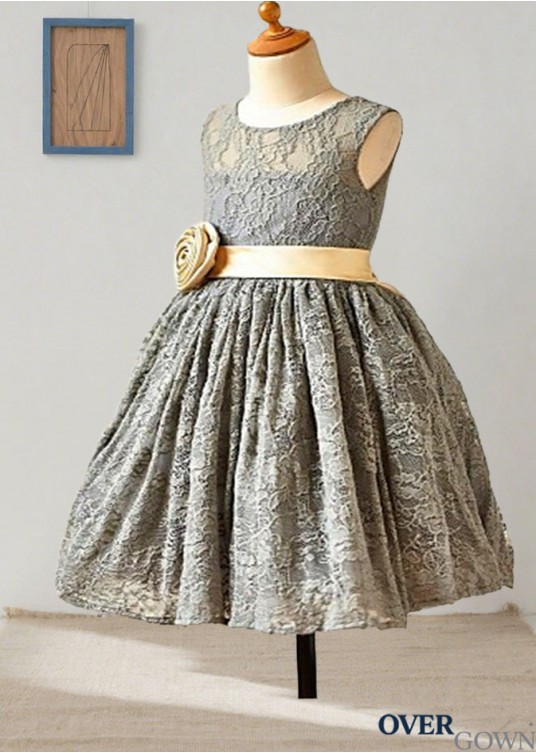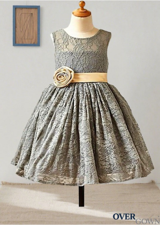 Tea-Length Lace Flower Girl A-Line Dress Scoop Zipper Hand-Made Flower Natural Waist