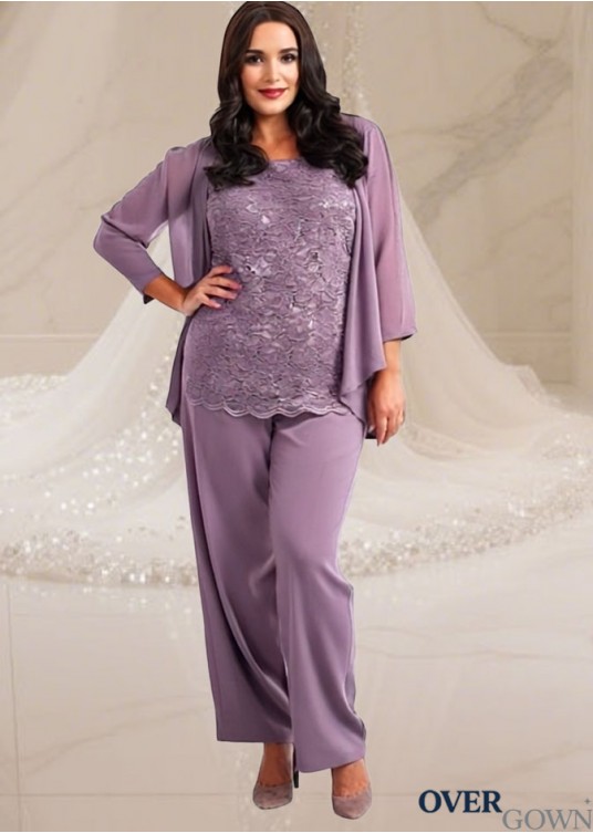 Elegant Lace Chiffon Scoop Neck Mother of the Bride Pantsuit