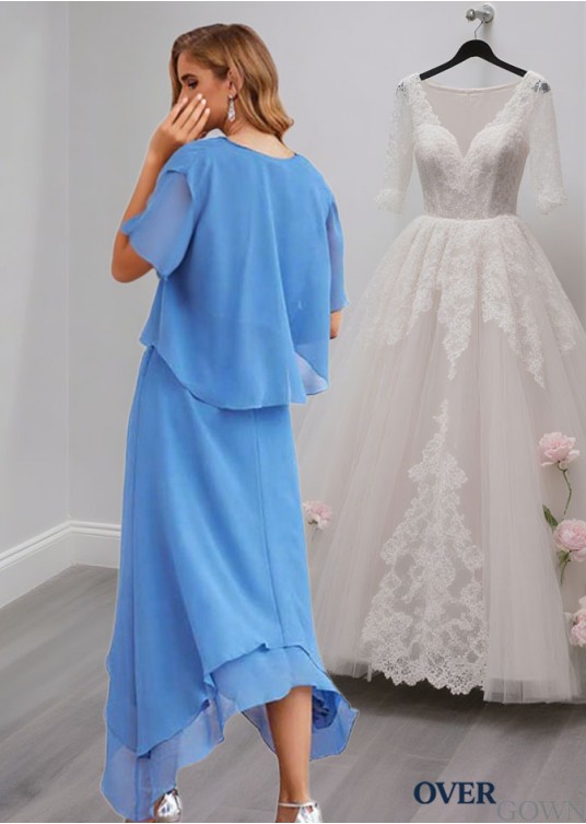 Chiffon Tea-Length Mother of the Bride Dress with Lace and 3/4 Sleeves