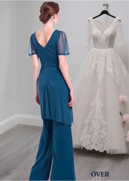 V-Neck Full-Length Chiffon Mother of the Bride Pantsuit with Sleeves