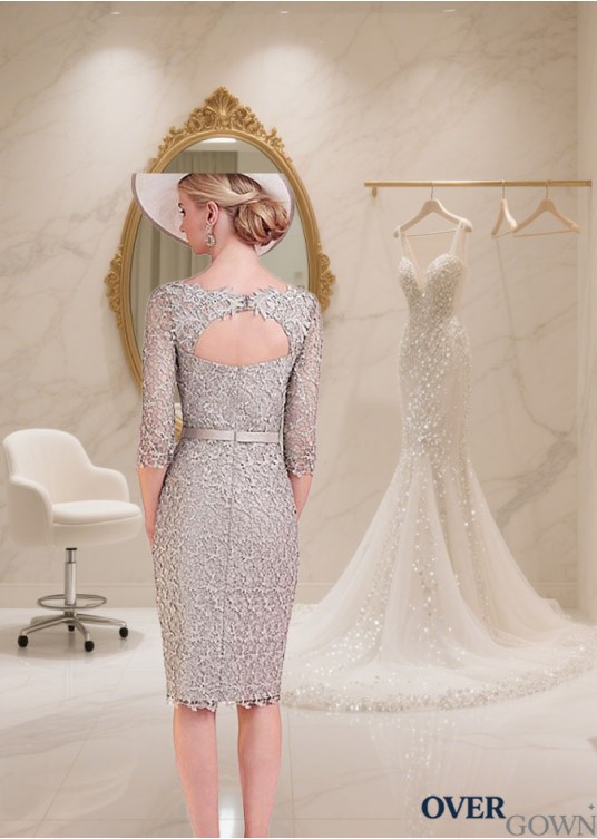 V Neck Lace Illusion Sleeve Knee Length Sheath Dress for Mother of the Bride
