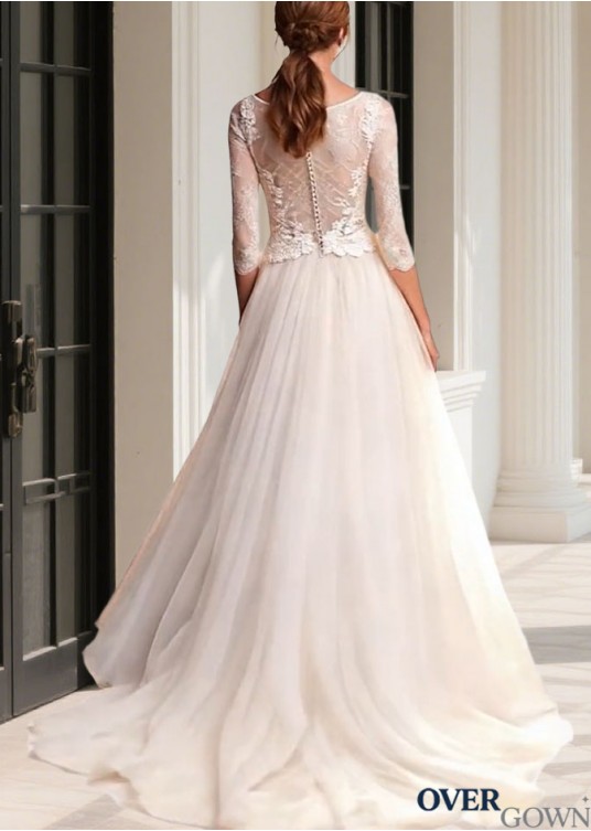 3/4 Sleeve A-Line Beach Bridal Gown Tulle Sweep Train