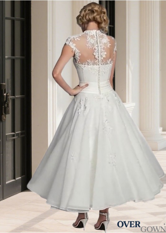 High Collar Tulle A Line Ankle Length Beach Wedding Dress for Brides