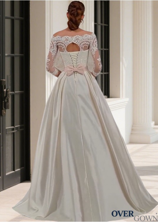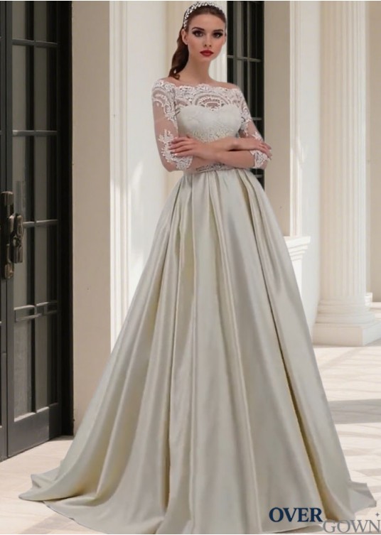Off-the-Shoulder 3/4 Sleeves A-Line Tulle Satin Wedding Dress with Beading