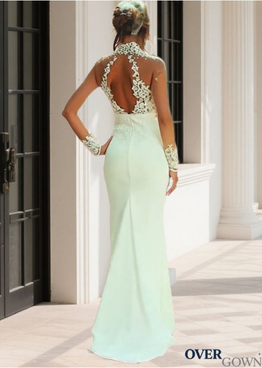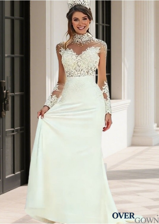 Illusion High Neck Sheath Wedding Gown Sweep Train Long Sleeves