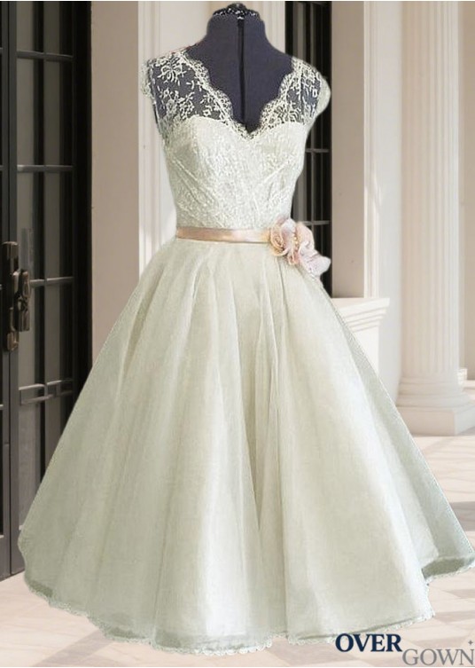 Tea-Length Short Wedding Dress with V-Neck and Natural Waist