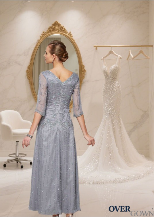 Elastic Satin V-Neck Ankle Length Dress With Sleeves — Evening Gown