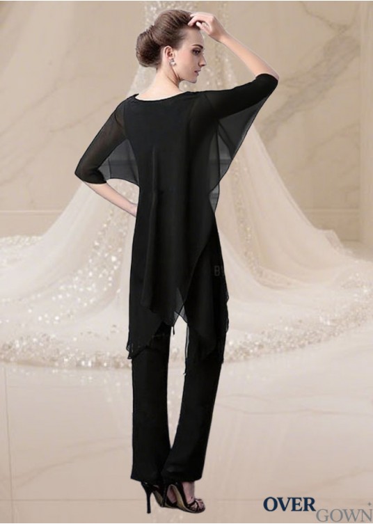 Elegant Black Chiffon Bateau Neck Mother of the Bride Pantsuit